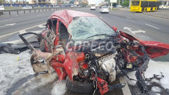 Водій таксі Kia Cerato не впорався з керуванням. Він пізно помітив опору шляхопроводу. Машину занесло і відкинуло у відбійник. Гальмівний шлях Кіа до відбійника - близько 35 м.
